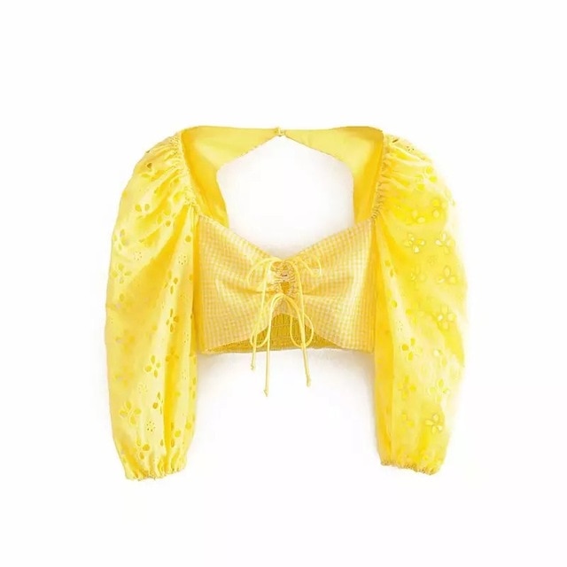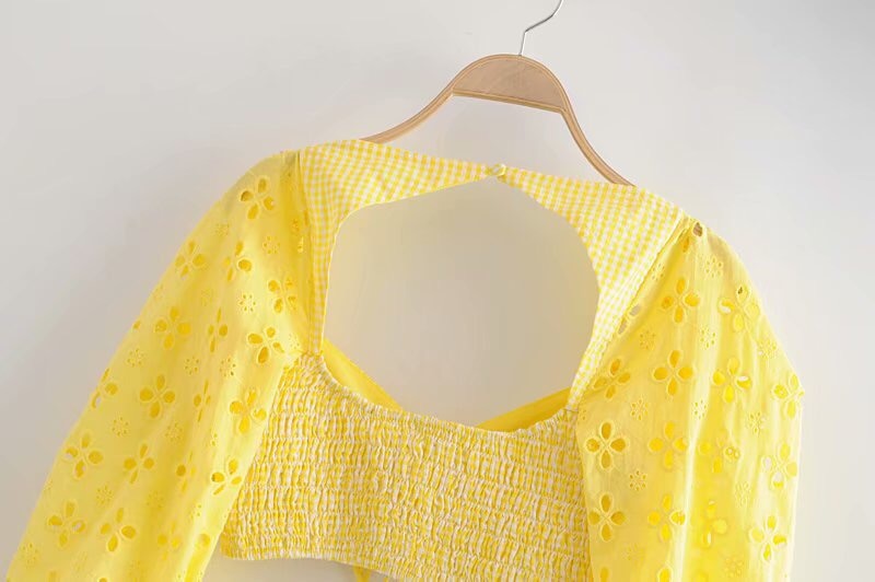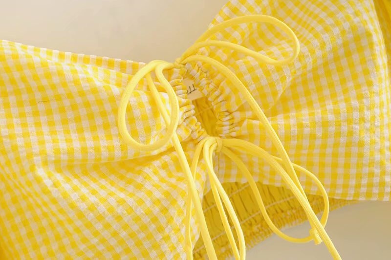 The Road Trip set features a vintage-style blouse in a yellow check pattern. The puff sleeves of the top have cutwork embroidery in solid yellow fabric. The blouse has a sweetheart neckline with a hollowed center.